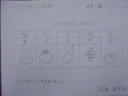 今日から1週間は、「残さず食べよう週間」です。給食に感謝し、すききらいせずに食べましょう。子どもたちは、給食委員会の子どもが作ってくれた「がんばりカード」を使います。