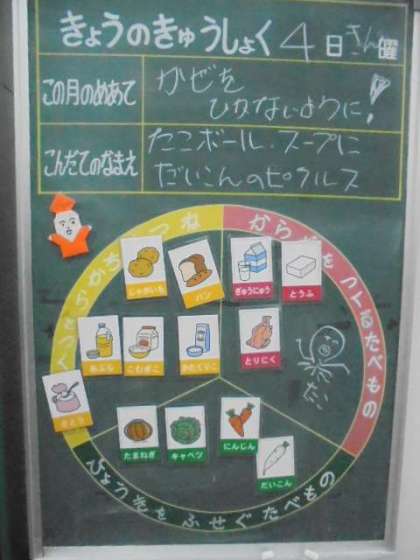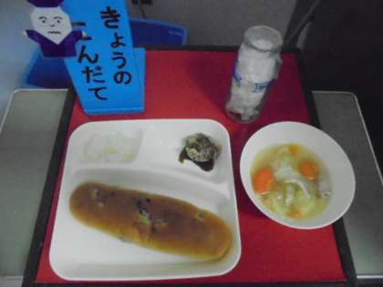 今日の献立は、たこボール、スープ煮、だいこんのピクルス、パン、牛乳です。
