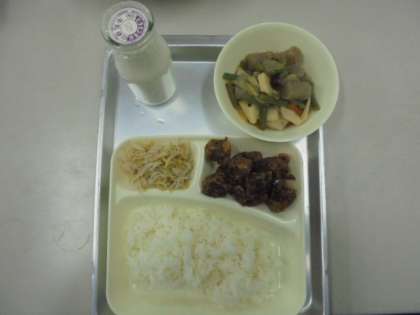 今日の献立は、くじらのたつたあげ、さといもと野菜の煮もの、もやしのゆずの香あえ、ごはん、牛乳です。