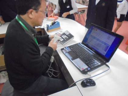 図書管理ソフトの入ったパソコンで、子どもたちが借りた本の返却や貸出を処理しています。時間短縮と正確な作業ができます。写真は、学校図書館補助員の小前先生です。