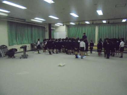 多目的室で、学生会の練習です。とても、元気な声が出ています。さて、右の絵は、どこで使うのでしょうか?