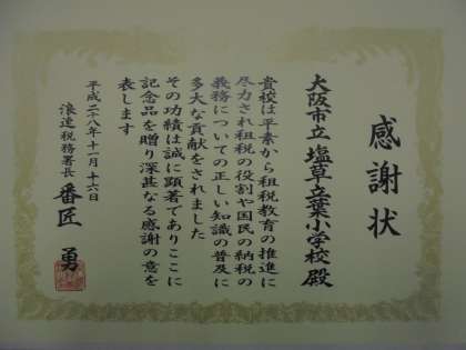 本校が、租税教育推進校として、浪速税務署長様から感謝状をいただきました。税務署による租税教室(6年生)や夏休みの税の習字などの取り組みが評価されて、浪速区で本校が選ばれたようです。ありがとうございました。