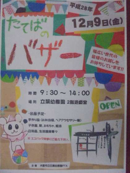 立葉幼稚園PTAの皆さんが、バザーを開催されます。12月9日(金)9:30〜14:00。立葉幼稚園の2階遊戯室にて。手づくりの品(お弁当袋、ヘアアクセサリー等)や子供服、靴、おもちゃ、絵本、日用品、生活雑貨等々、素敵なグッズが出品されます。ぜひ、足をお運びください!詳しくは、本校の正門にポスターを掲示しています。