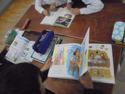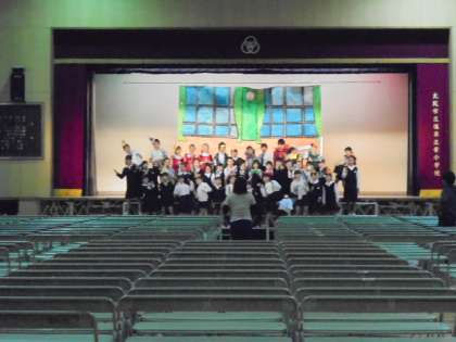 (写真左)国語科で、暮らしの中の和と洋について、資料を使って調べています。(写真右)学芸会練習。みんなで記念撮影です。