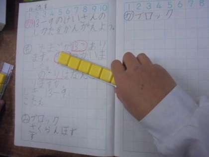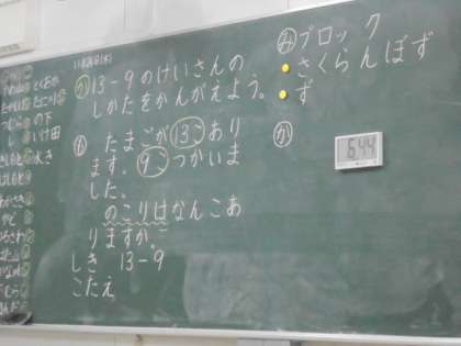 13−9の計算のしかたを考える算数科の授業です。先生は、子どもたちにいろいろな解き方を考えさせています。図やブロック、さくらんぼ図など子どもの発想を大切にしながら、ていねいに進めています。1年生も、上手にノートを書いています。