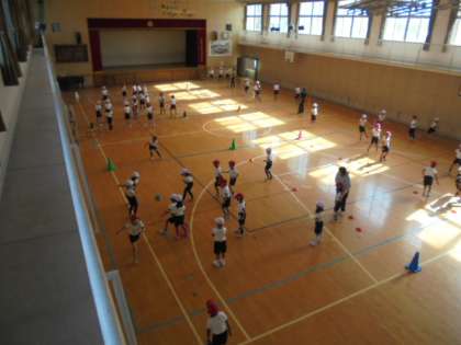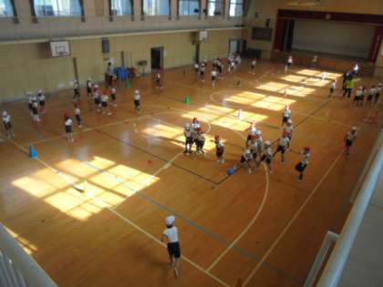 体育館で、2年生全員がドッジボールを楽しんでいます。やわらかいボールを使っているので、当たっても痛くないようです。子どもたちの歓声が、外まで聞こえています。