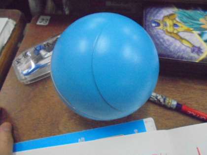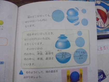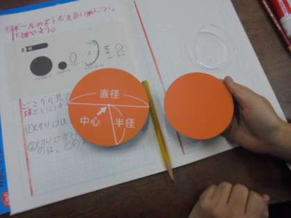 算数科で、「まるい形を調べよう」の学習です。先生は、ドッジボールやゴムボール、テニスボールなどを例にして、わかりやすく説明しています。そして、まるい形の切り口がよくわかる球体の教具が活躍しました。