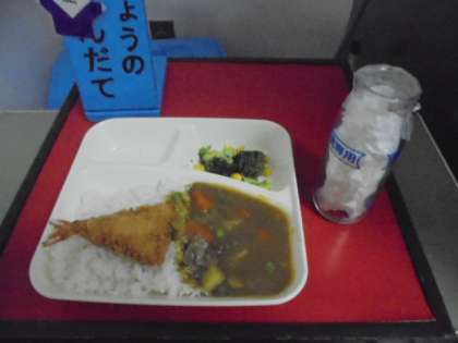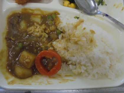 今日の献立は、えびフライカレーライス、ブロッコリーとコーンのサラダ、豆こんぶ、ごはん、牛乳です。(写真:下)職員室のカレーの中に、ラッキーにんじん(給食調理員さんが、にんじんをハート形にくりぬいてくださったもの)の裏バージョン(くりぬいたあと)が入っていました!!