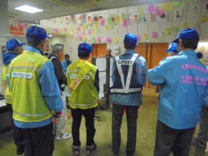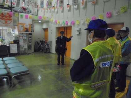 塩草地域の皆さんが、防犯パトロールのため浪速区民センターに集合されました。時刻は午後7時です。大谷連合町会長と桜川交番警察官がお話をしてくださっています。皆さん、寒い中、地域の安全安心のためありがとうございます。
