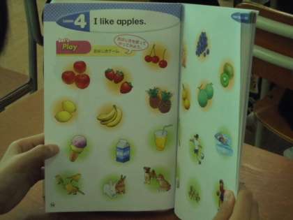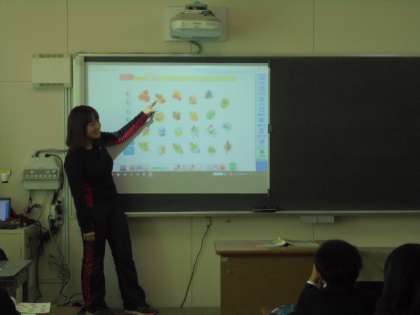 担任の先生が、文部科学省からの資料「Hi,friends!(ハイフレンズ)」を使って外国語活動の授業をしています。教室中に英語が響き、ゲームも交えて楽しく学んでいます。