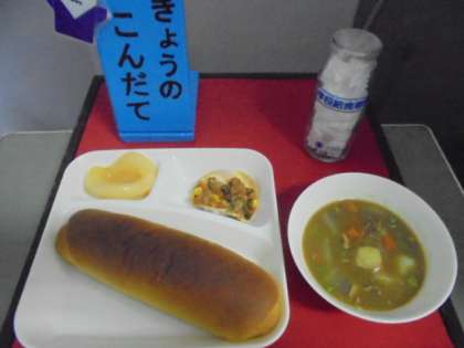 今日の献立は、豚肉とだいこんのカレー煮、変わりピザ、白桃(缶)、パン、牛乳です。