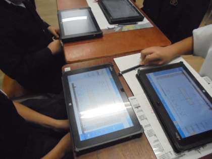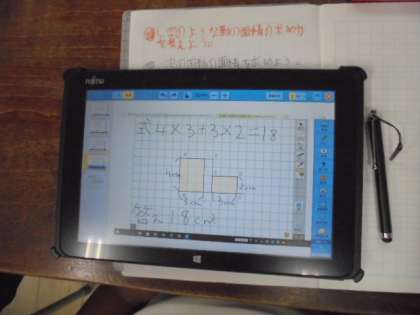 今日の5時限目は、4年1組(藤本学級)の公開授業です。算数科の学習で、単元は「広さを調べよう」。今日は、L字のような形の面積の求め方を考えました。端末タブレットを子どもたち一人一人に渡し、図形を切り取ったり、つなげたりして、面積を考えました。どの子どももタブレットの操作に慣れてきています!