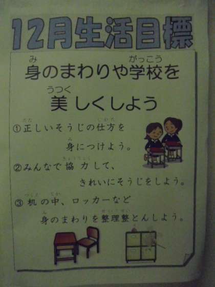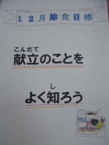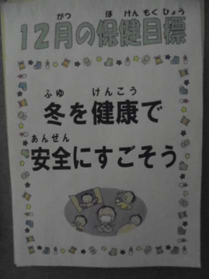 12月になりました。1年間のしめくくりをしっかりしましょう。(上:生活目標、中:保健目標、下:給食目標)