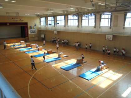 体育館で、跳び箱に挑戦しています。子どもたちのめあてに合わせて、違う高さの跳び箱をいくつも用意し、安全面にも十分気をつけた素晴らしい授業です。