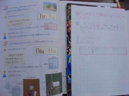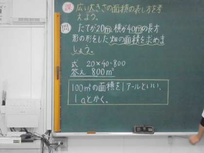 算数科の学習で、広い大きさの面積の表し方を考えています。a(アール)とha(ヘクタール)の単位を学習します。