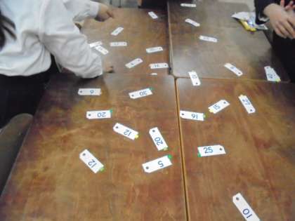 2年生が、かけ算九九の計算カードを使ってグループでカルタ大会をしていました。先生が式を読み上げると、子どもたちが答えを書いたカードをとります。大盛り上がり!!