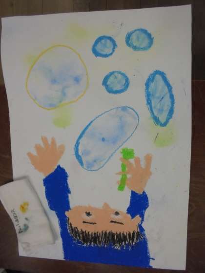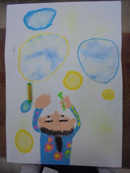 図画工作科で、パスを使ってシャボン玉をとばしている様子を描いています。色鮮やかに、表現できましたね。