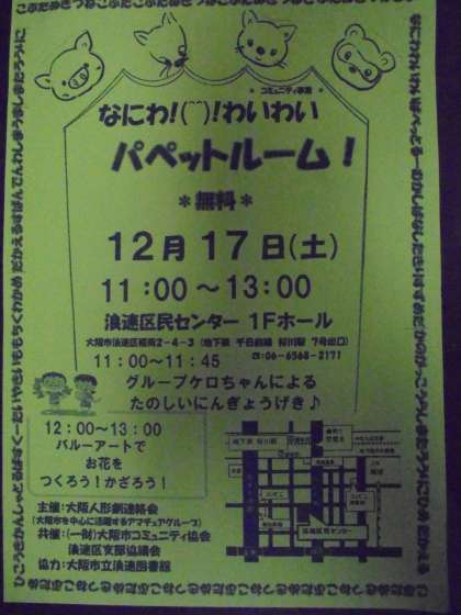 浪速区民センターの方が、子どもたちににんぎょうげきとバルーンアートのイベントを案内してくださいました。チラシもいただきました。今週土曜日に行われます。詳しくは、こちらをご覧ください。→浪速区民センターイベント年間予定