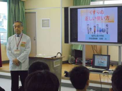 5時限目に、6年生を対象とした「くすりの正しい使い方教室」を行いました。講師として、本校薬剤師の阿部 力先生(浪速区薬剤師会会長)にお越しいただきました。