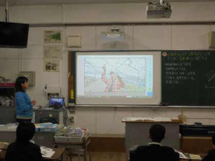 デジタル教科書を使って、ぶどう農家の方のお話を動画で見ています。社会科でも、ICT教育が進んでいます。