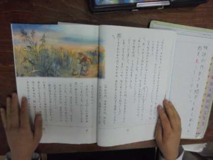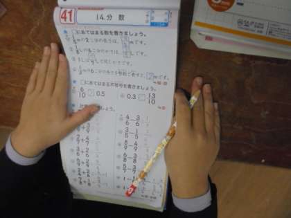 (写真上)昨日に続いて、国語科の学習です。先生のアドバイスで、はりねずみのおじいさんとりす、からす、くも、子ぐまさんたちの気持ちをじっくり考えています。(写真下)となりのクラスでは、算数の分数の計算をしていました。