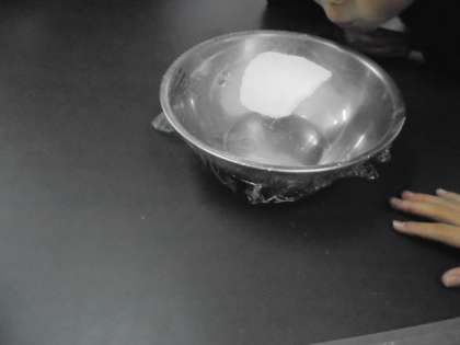 今日は、理科室で、ラップの上に塩を集める⇒ラップに向かって声を出す⇒ラップが振動して、塩が動くという実験をしました。他にも、表面張力の実験などをしました。