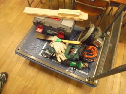管理作業員の小林さんに、傷んでいる教室の床を補修していただきました。必要な工具や材料を台車で運び込み(写真上)、作業が無事終了しました(写真中、下)。続いて、他の教室の床補修にかかります。子どもたちのために、ありがとうございます。
