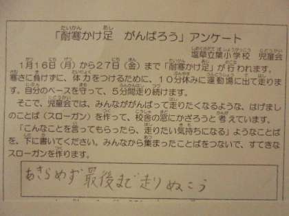 来週から始まる「耐寒かけ足週間」に向けて、児童会の皆さんが「がんばって走りたくなるような、はげましのことば(スローガン)」を募ってくれています。みんなから集まったことばをつないで、すてきなスローガンをつくるそうです。楽しみです。ありがとう!