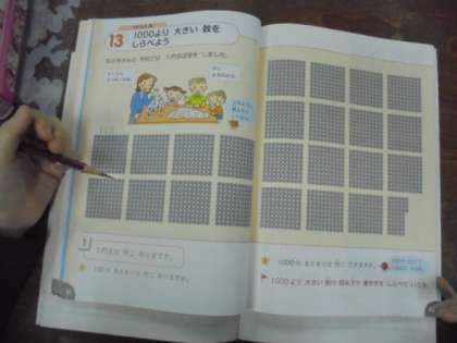 2年生の教室では、算数科の「1000より大きい数をしらべよう」を学習しています。教科書の小さな点を1円玉に置き換えるといくらになるかな?みんな、一生懸命に数えています。