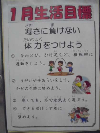 今月の生活目標は、「寒さに負けない体力をつけよう」です。休み時間には、運動場で元気いっぱい遊ぶ子どもがたくさんいます。寒くなってきますが、いっぱい遊び、運動して、からだをきたえましょう>