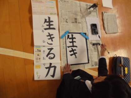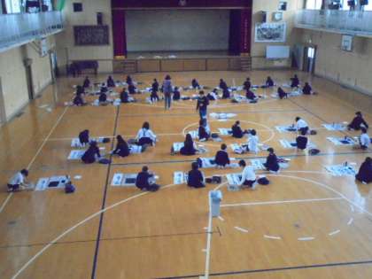 講堂で、毛筆による書き初めを練習しています。お正月らしい琴のBGMを聞きながら、心静かに集中しています。よくできました!