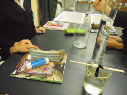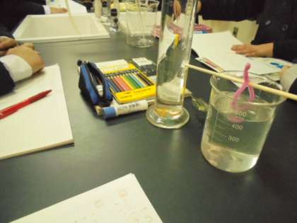理科室で「もののとけ方」について実験しています。塩とパインアメを溶かしたそうです。