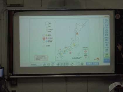 デジタル教科書を使って、大阪府について学習しています。先生が、スクリーンに大きく映してわかりやすく説明しています。