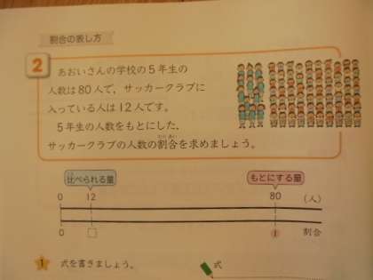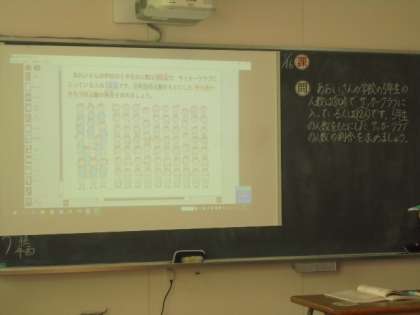 「割合」について、学習しています。先生が、電子黒板で教科書の問題を拡大して説明しています。わかりやすいですね。