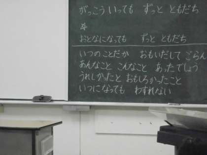 1年生の教室から、きれいな歌声が聞こえてきました。「いつのことだか おもいだしてごらん あんなこと こんなこと あったでしょう♪」子どもたちの澄んだ声に、心が癒されました。