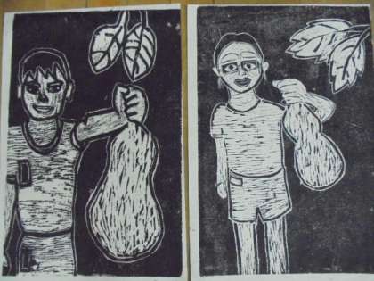 大きいひょうたんを手にした自分を描いています。ダイナミックな表現がいいですね。