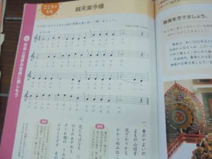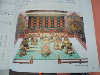 6年生が、「日本と政界の音楽に親しもう」として、日本の雅楽をきいています。演目は、「越天楽今様(えてんらくいまよう)」です。