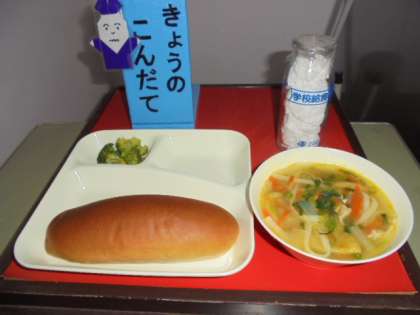 今日の献立は、五目うどん、ブロッコリーのごまあえ、りんご、パン、牛乳です。