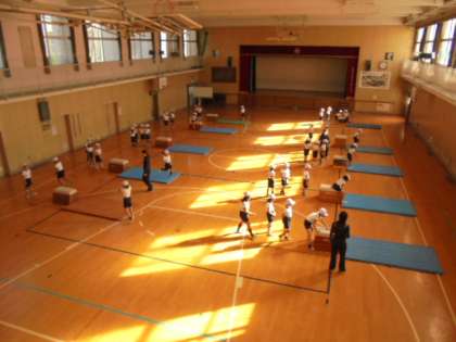 体育館で、跳び箱をしています。先生方が巧みに補助をしたり、跳びやすいよう段階的に指導をしたりして、怖さを克服できるよう励ましています。