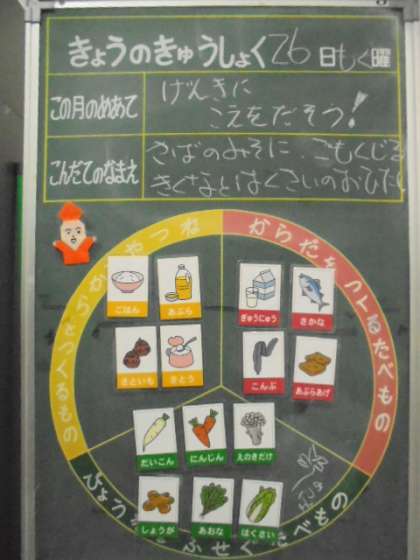 今日の献立は、さばのみそ煮、五目汁、きくなとはくさいのおひたし、ごはん、牛乳です。