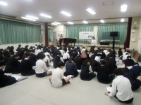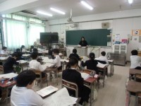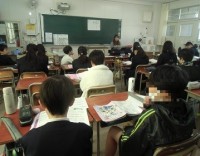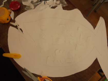 1年生の教室に入ると、「みて、みてー」というかわらしい声がしました。さかなを題材にした紙版画を作っています。どれも、素敵な作品です。
