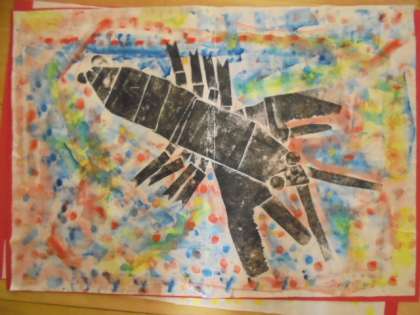 ザリガニの紙版画が、いよいよ完成です。色鮮やかで、素晴らしい作品です。