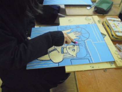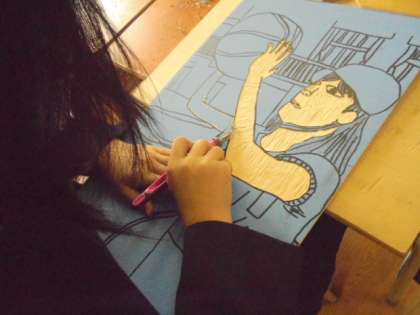 彫刻刀を使って、木版画に取り組んでいます。どの子どもも、真剣です。
