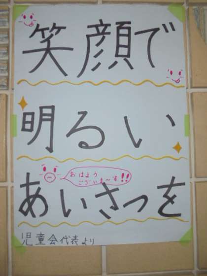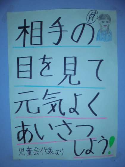 今日から来週の15日(水)までは、「気もちが伝わるあいさつ週間」です。全校朝会では、児童会代表の子どもたちがあいさつについて呼びかけてくれました。(写真上)また、教室前などに手作りのポスターがはっていて、盛り上がっています。(写真中、下)