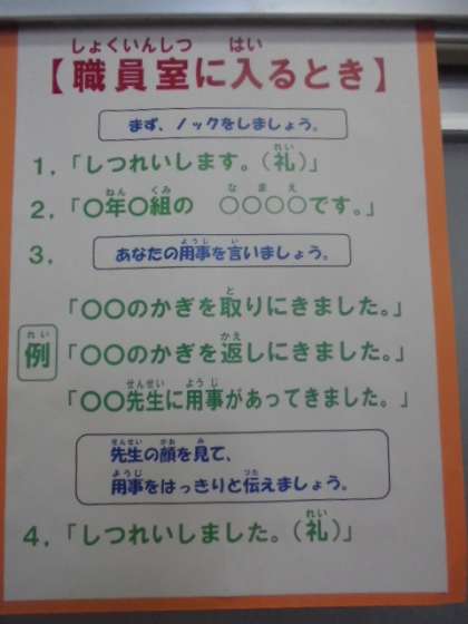 生活指導部長の細田先生より、職員室へ入る時のルールについて説明をしていただきました。6年生の子どもが、とてもわかりやすい、素晴らしい模範を見せてくれました。