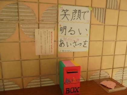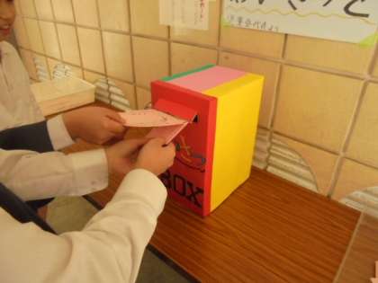 「あいさつをしてもらってうれしかったこと」をカードに書いて、ボックスに入れています。たくさんの「うれしい」が集まっています。
