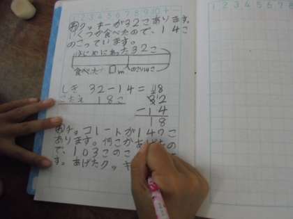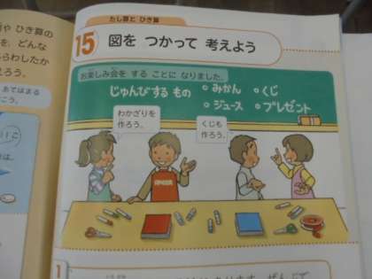 2年生は、国語科で「あなのやくわり」を考える説明文を学習しています。算数科では、「図をつかって考えよう」の単元で、文章問題をといています。