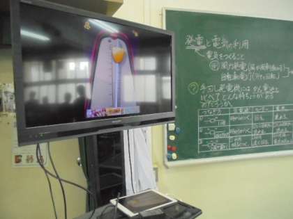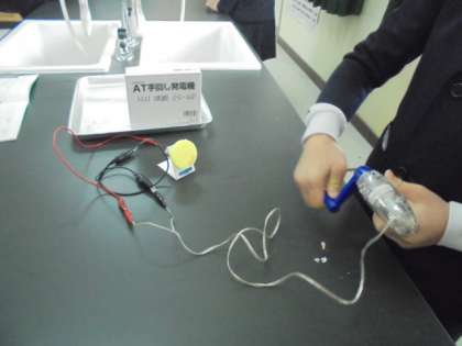 手回し発電機を使って、発電と電気の利用について考えています。グループで楽しそうに活動しています。