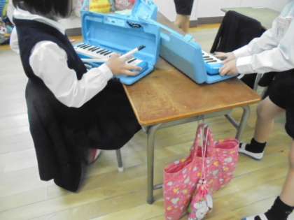 今日は、雨のため運動場で遊ぶことができません。1年生の教室では、遊びを工夫していました。けん玉やあやとり、鍵盤ハーモニカ・・・・。