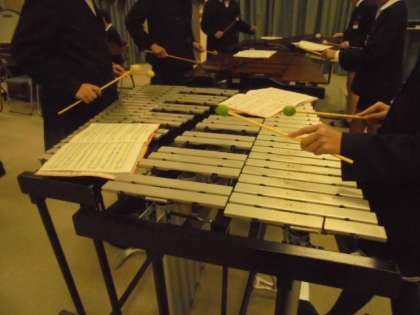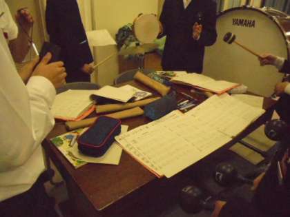 銀河鉄道999を合奏しています。ピアノや鉄琴、タンブリン、大太鼓などめいめいのパートで練習しています。いい音が響いています。